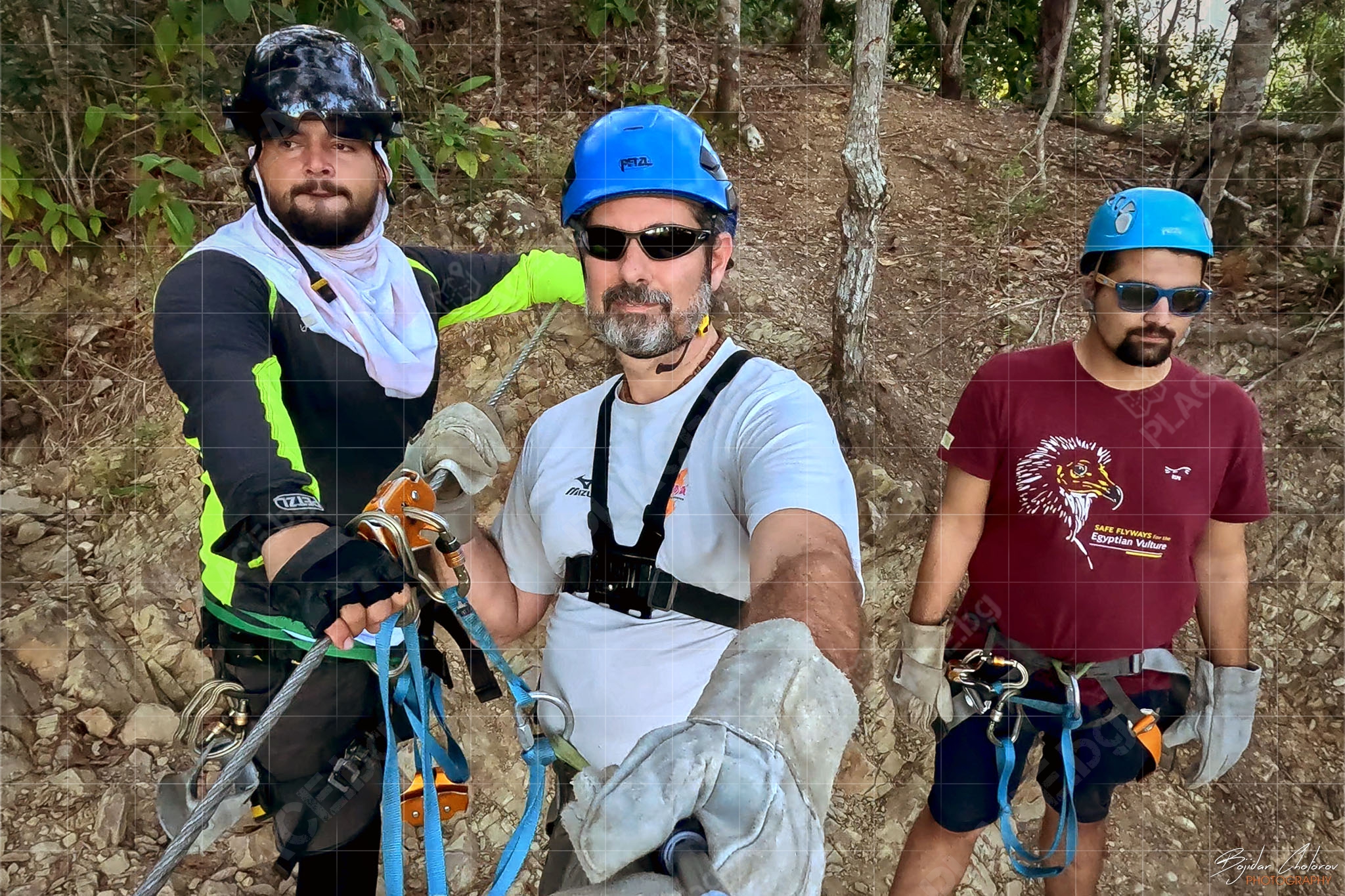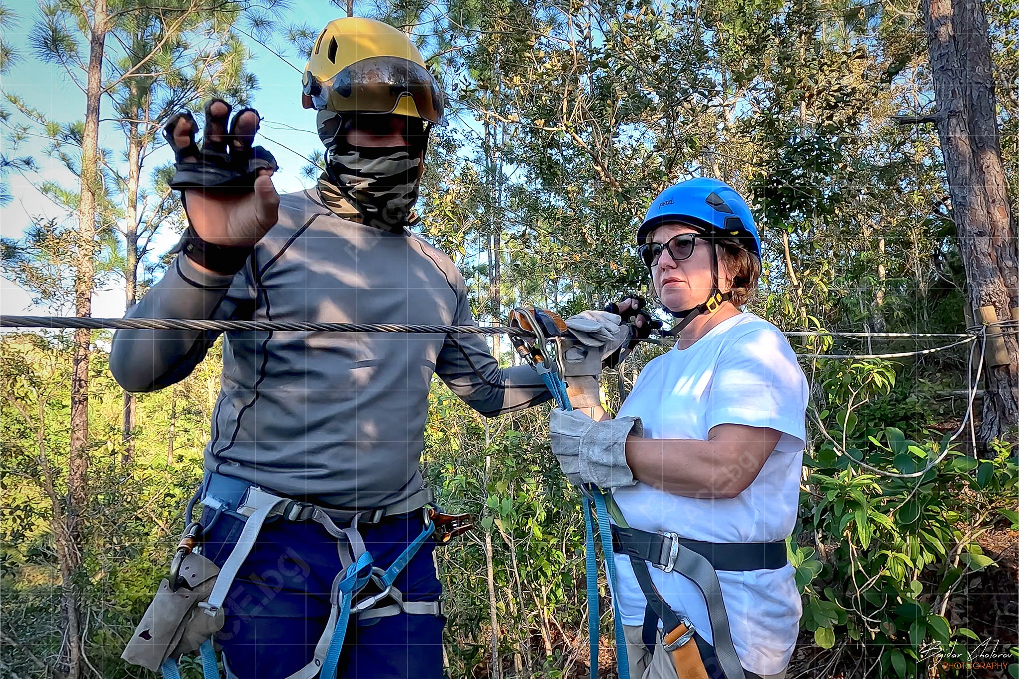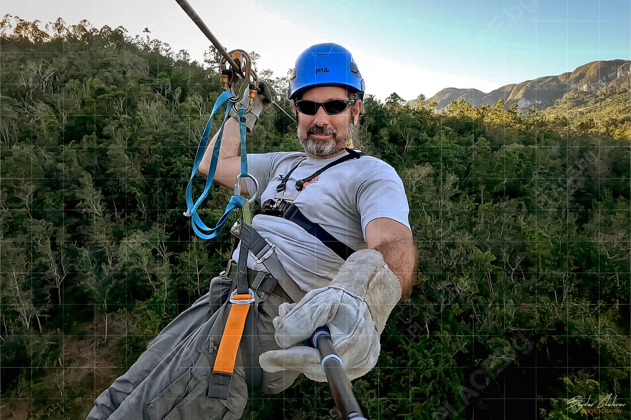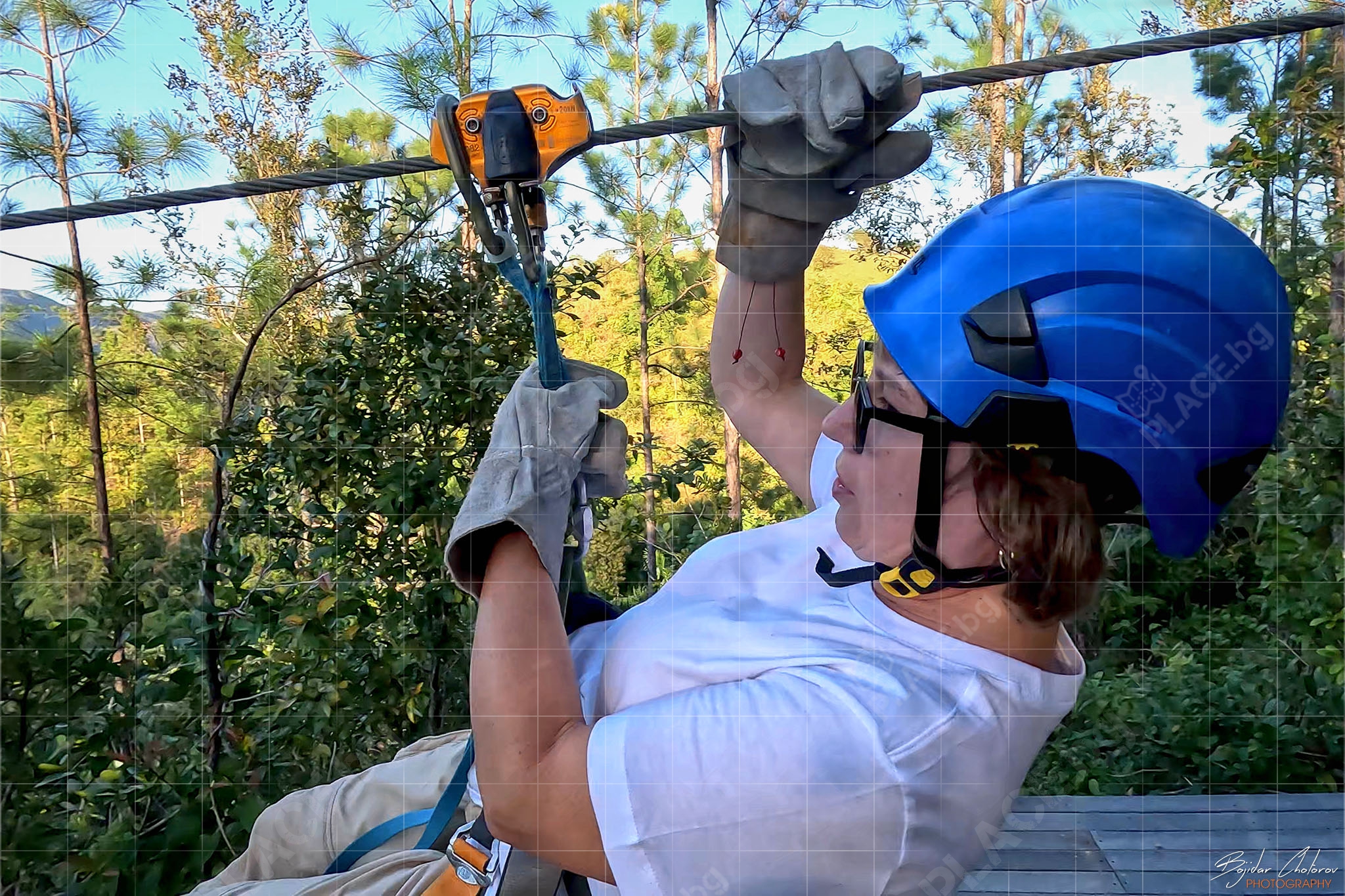 Това, което приятно ме изненада още в самото начало беше екипировката и оборудването – всичко беше на „Petzl“ (от сбруите до каските, от лените до карабинерите и макарите). Това беше и единственият „въжен тролей“, на който ни оборудваха с дебели кожени ръкавици, като единствена възможност за контрол на скоростта (не че имаше нужда) по време на спускането.