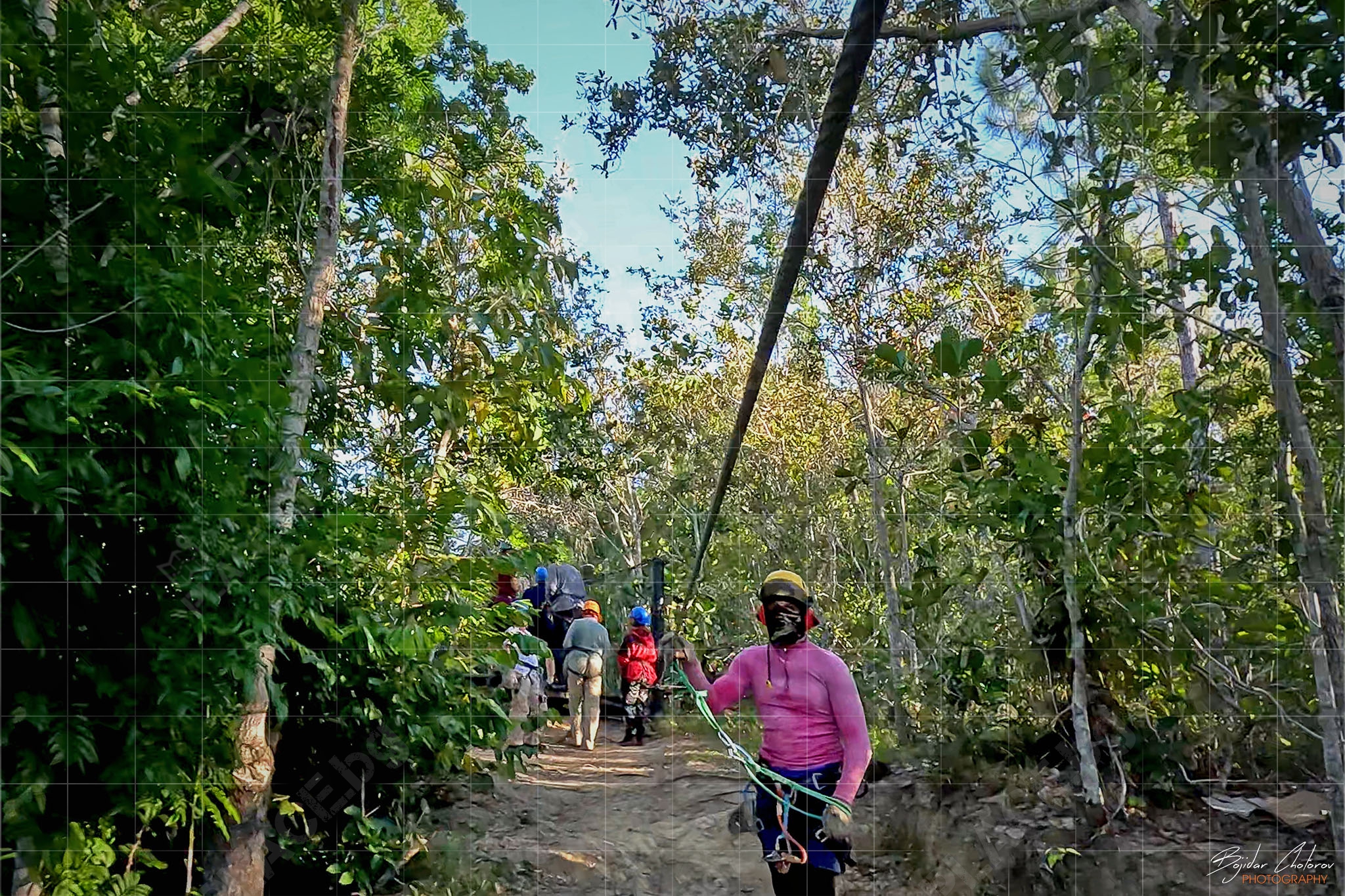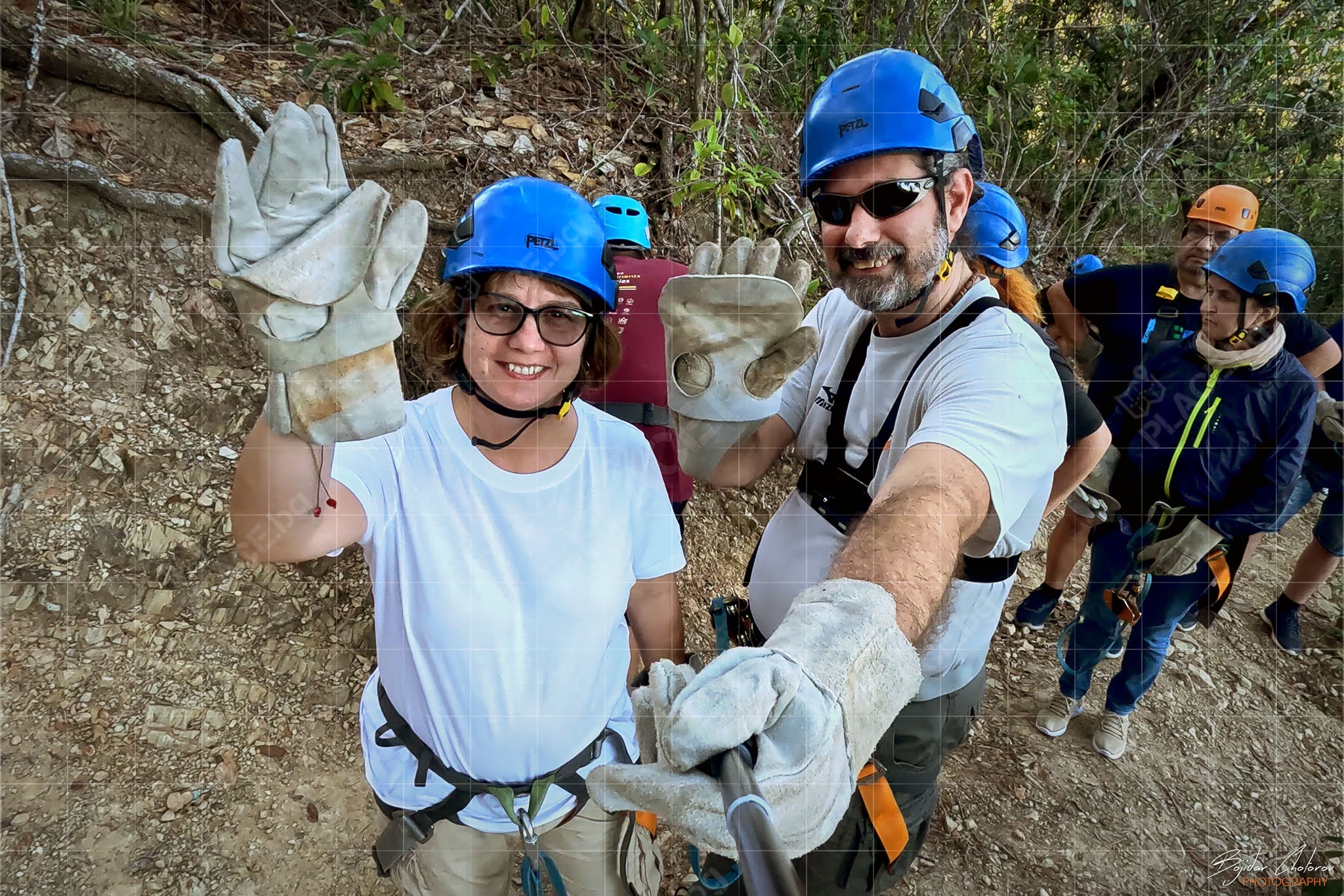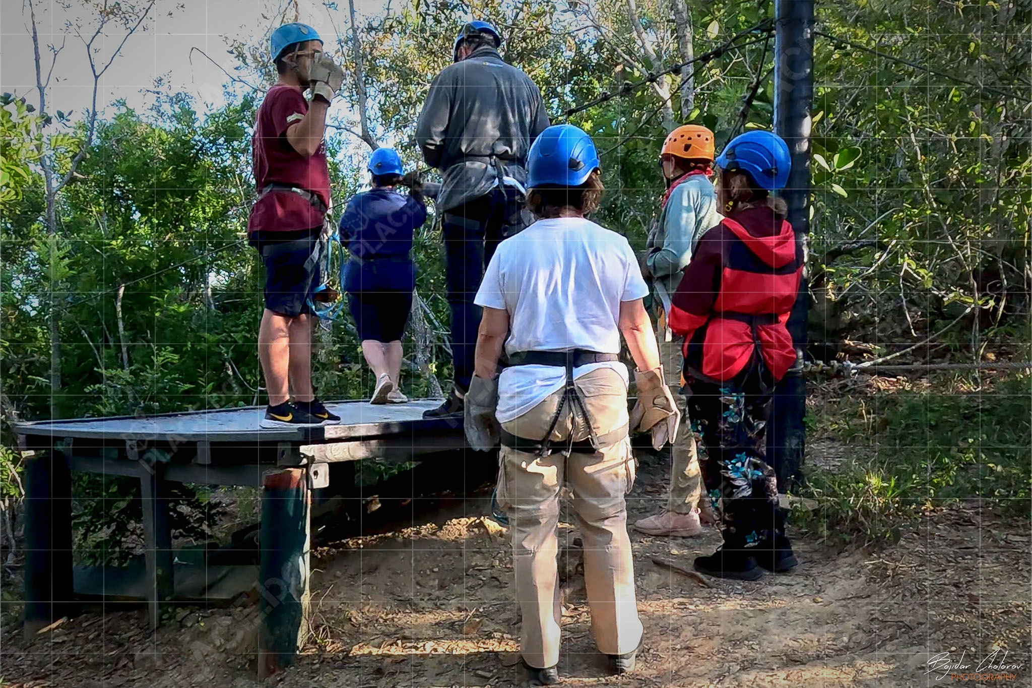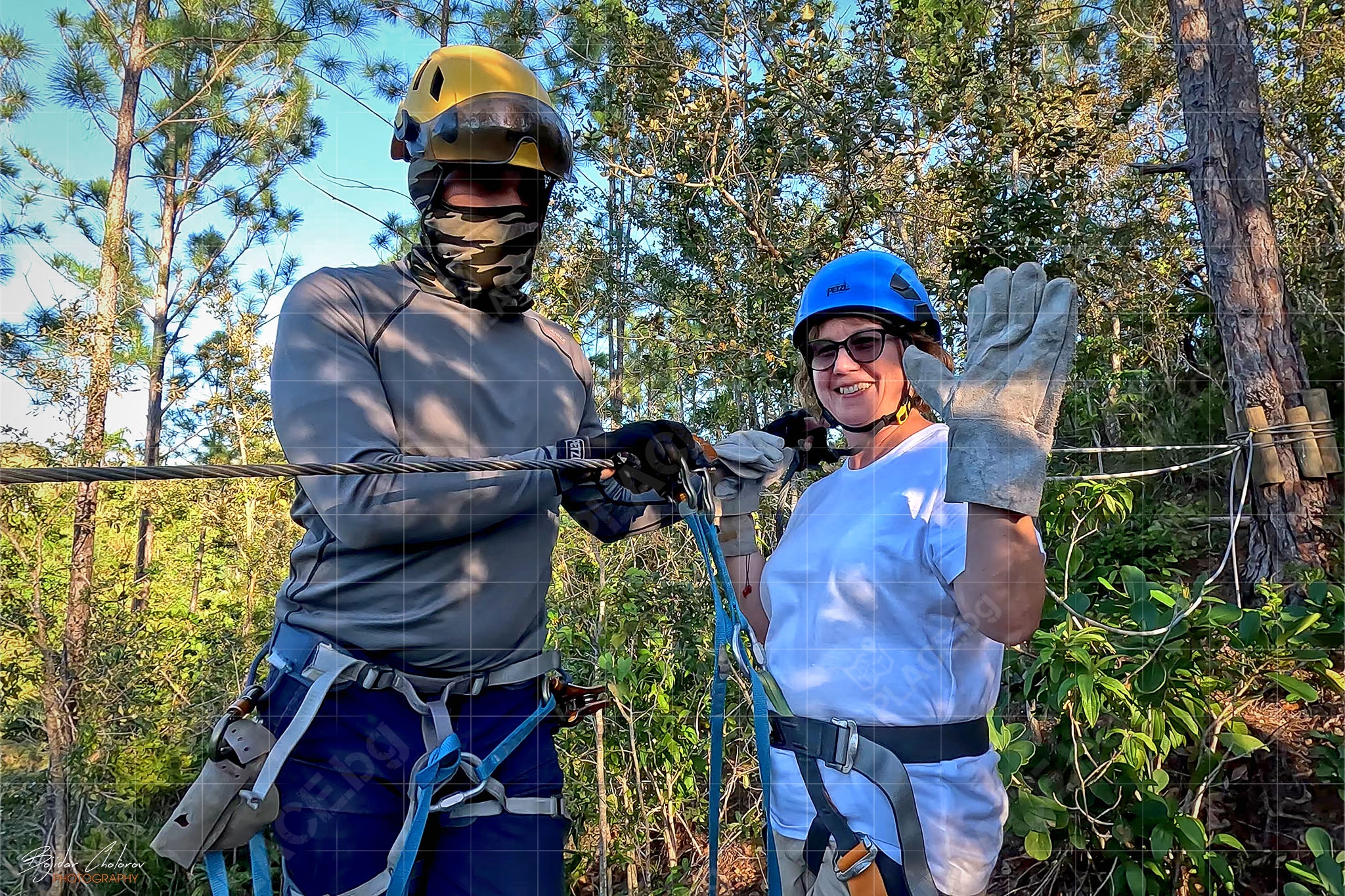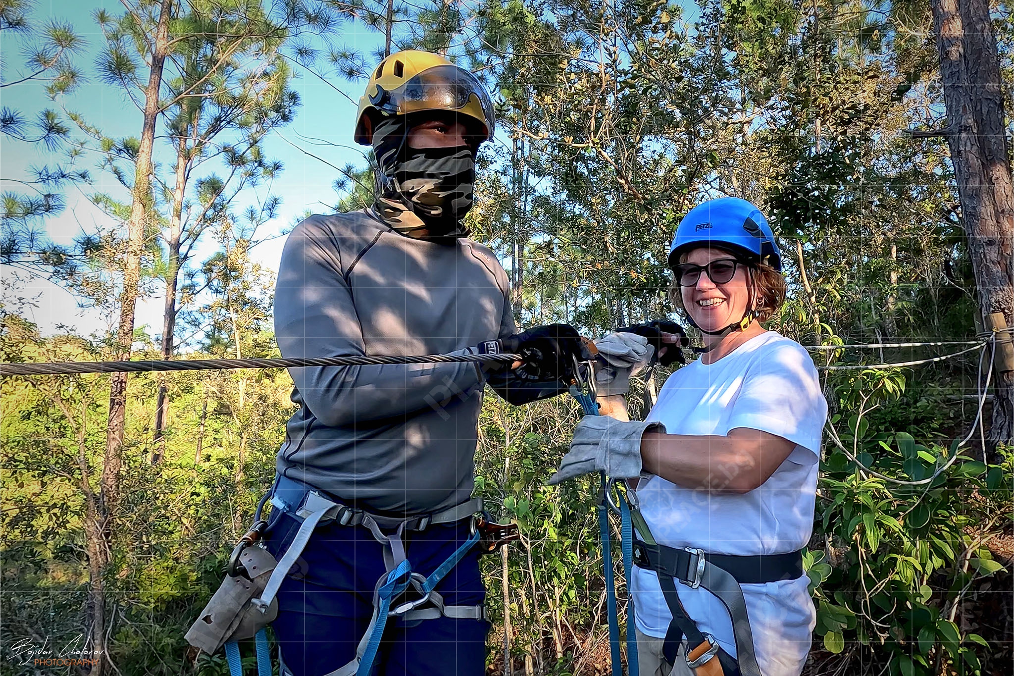 Това, което приятно ме изненада още в самото начало беше екипировката и оборудването – всичко беше на „Petzl“ (от сбруите до каските, от лените до карабинерите и макарите). Това беше и единственият „въжен тролей“, на който ни оборудваха с дебели кожени ръкавици, като единствена възможност за контрол на скоростта (не че имаше нужда) по време на спускането.